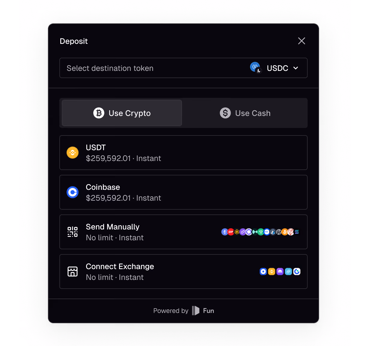 Some users prefer crypto, and others prefer fiat. Fun’s deposit modal adapts to each user based on their state.